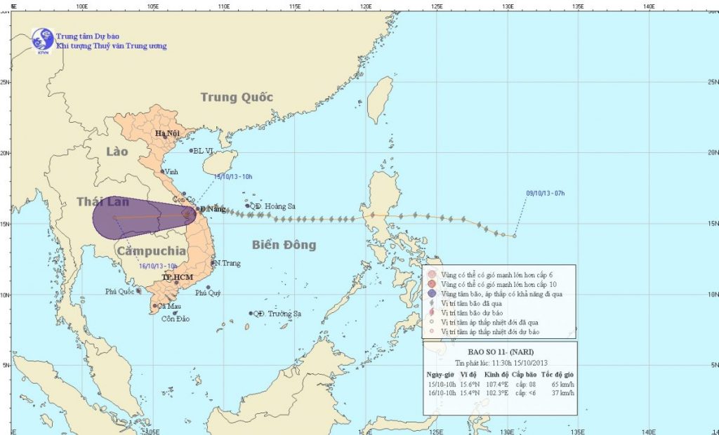 Lúc 10 giờ sáng ngày 15/10, vị trí tâm bão ở vào khoảng 15,6 độ Vĩ Bắc; 107,4 độ Kinh Đông, trên khu vực biên giới Việt – Lào. Sức gió mạnh nhất ở vùng gần tâm bão mạnh cấp 8 (tức là từ 62 đến 74 km một giờ), giật cấp 9, cấp 10.